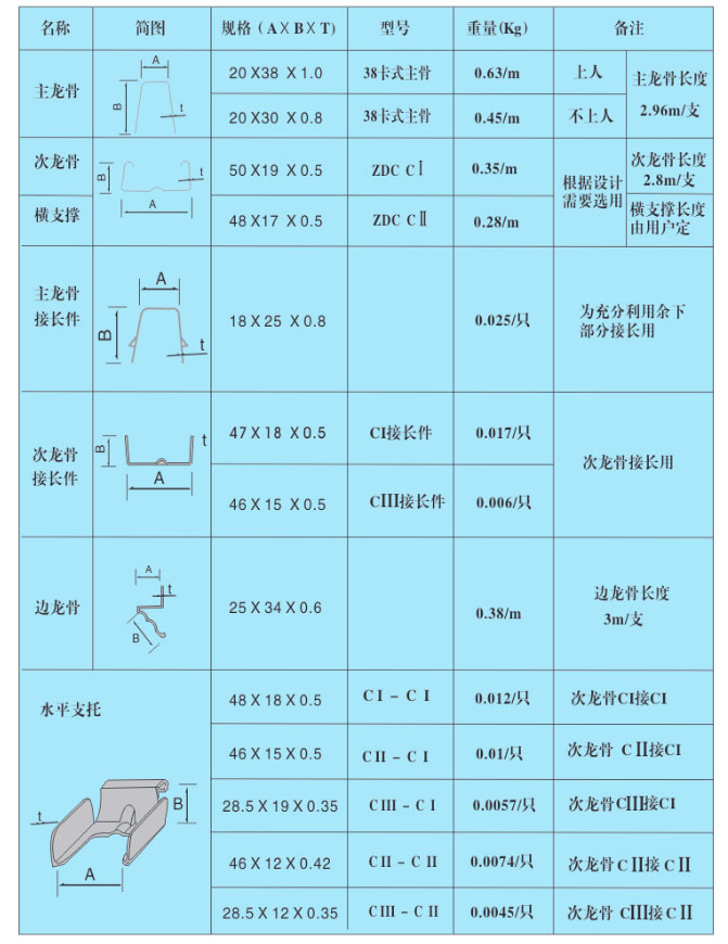 卡式龍骨規(guī)格表如下圖
